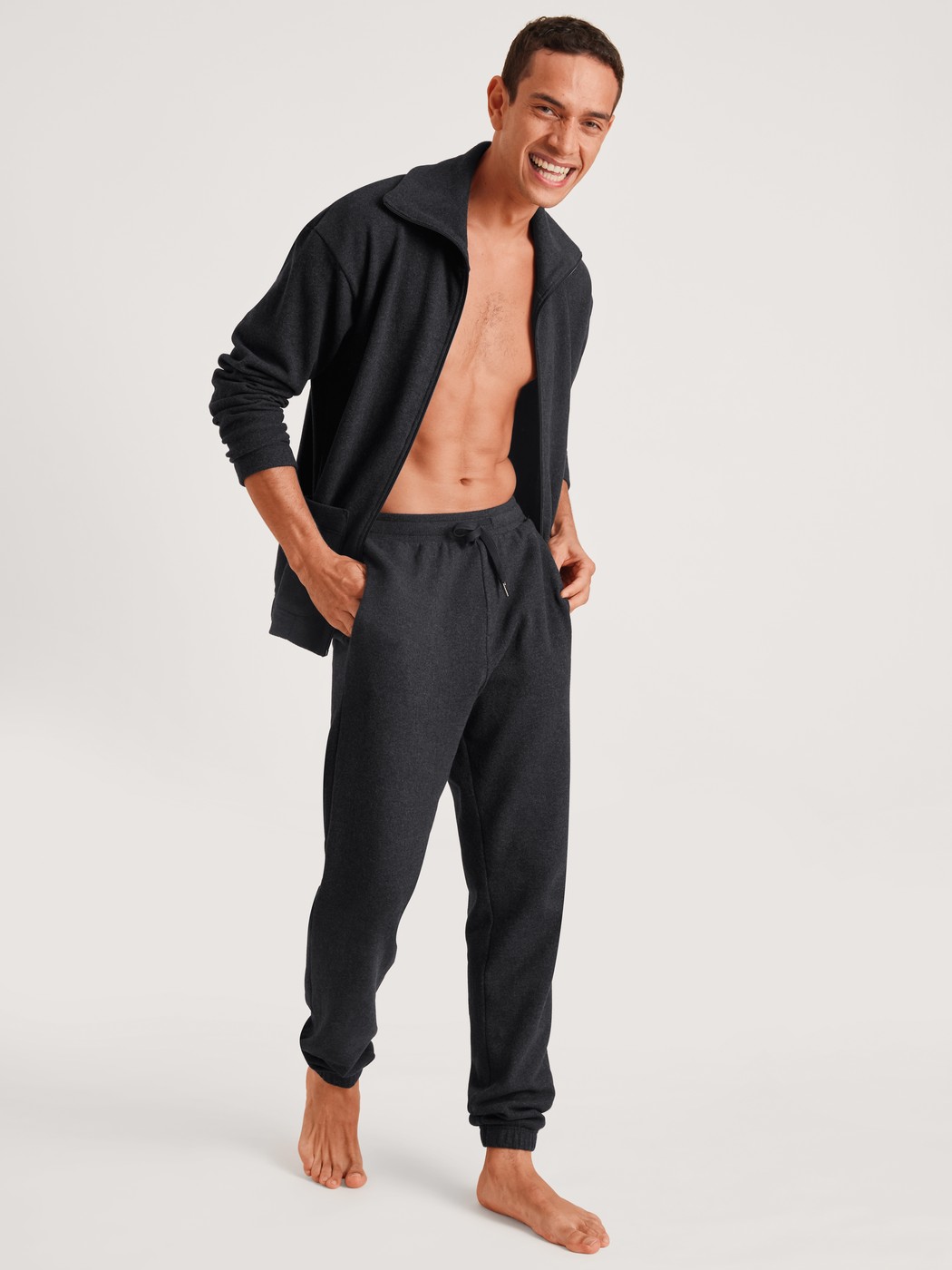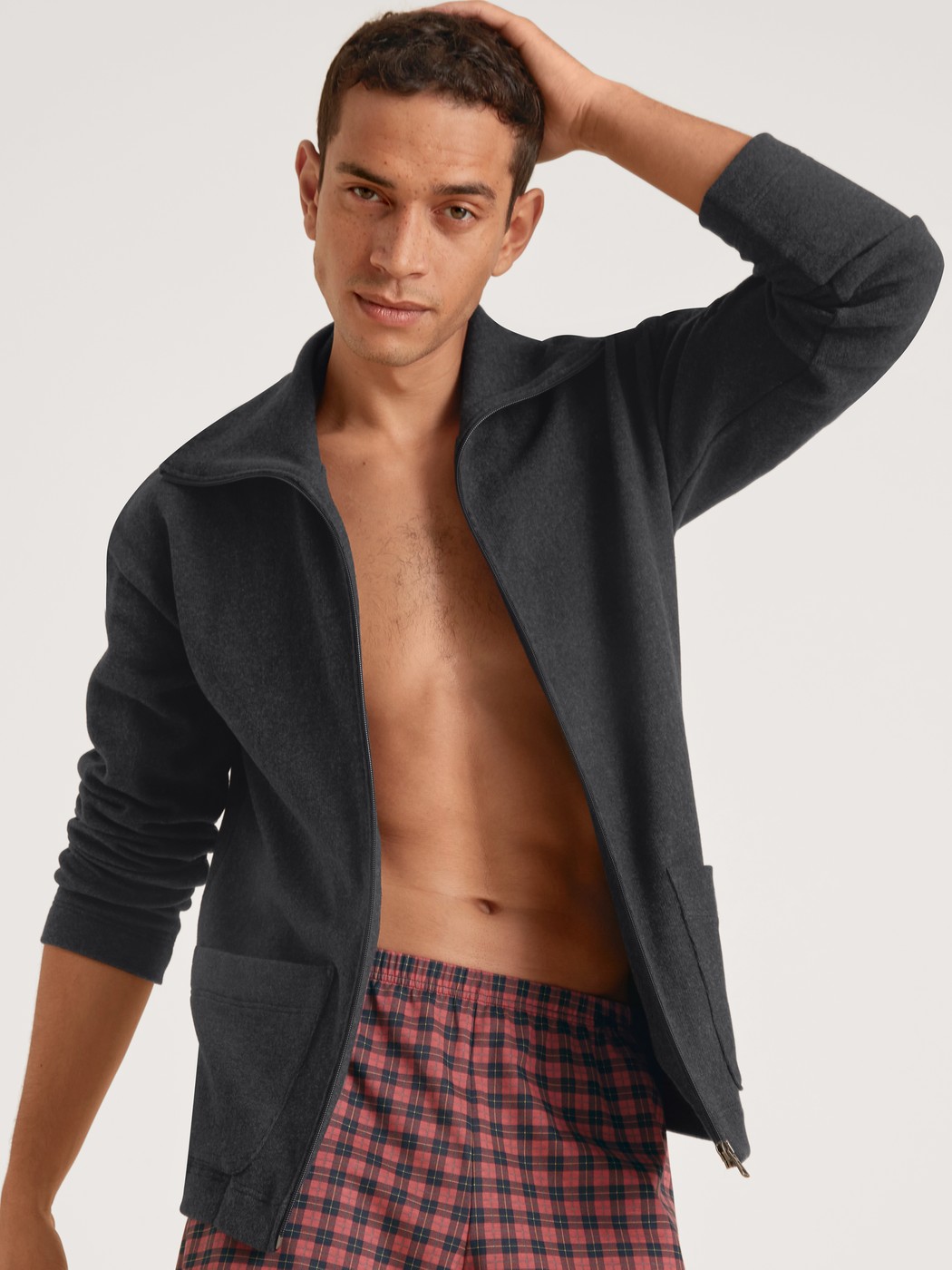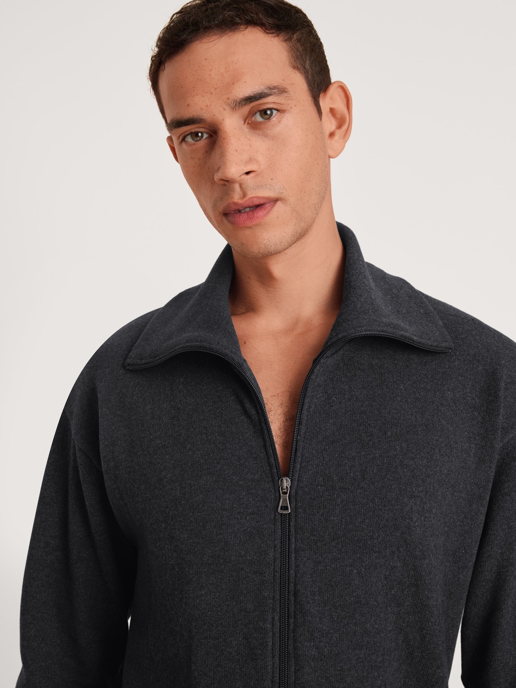 The jacket from the REMIX LOUNGE TIME OFF line from CALIDA doesn’t just guarantee an instant sporty look. Wonderfully soft jersey knit made from melange-look recycled yarn keeps you warm throughout the day, whether you’ve just finished exercising or are lounging on the couch. The large turn-down collar, zipper, patch-style pockets and slight drop shoulders complete the look to perfection.