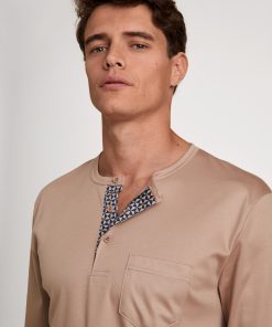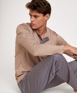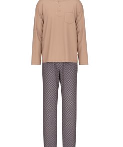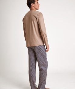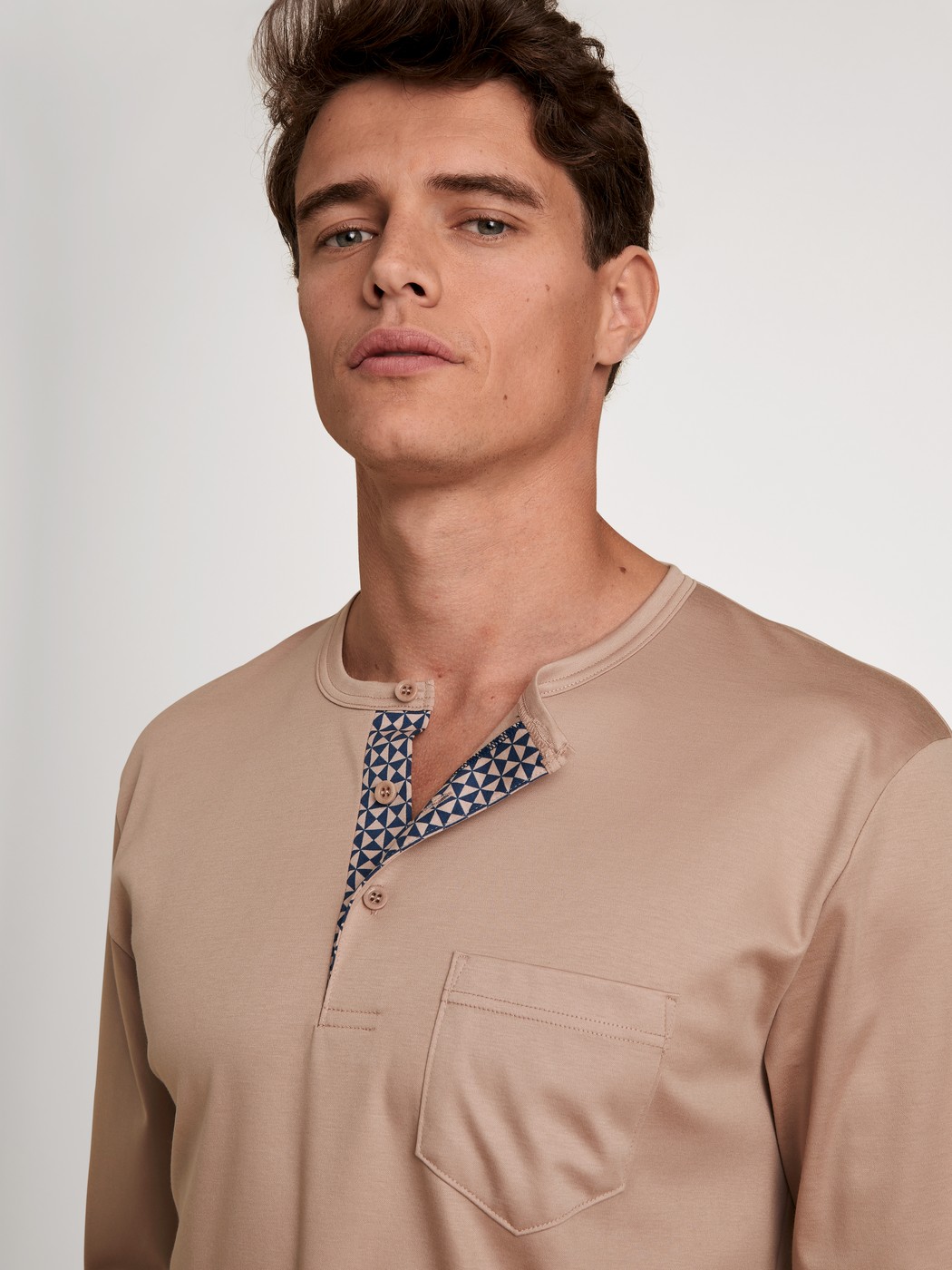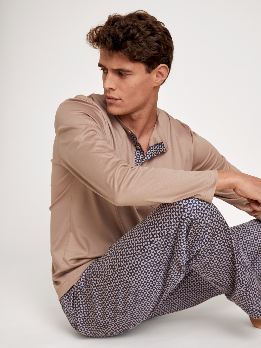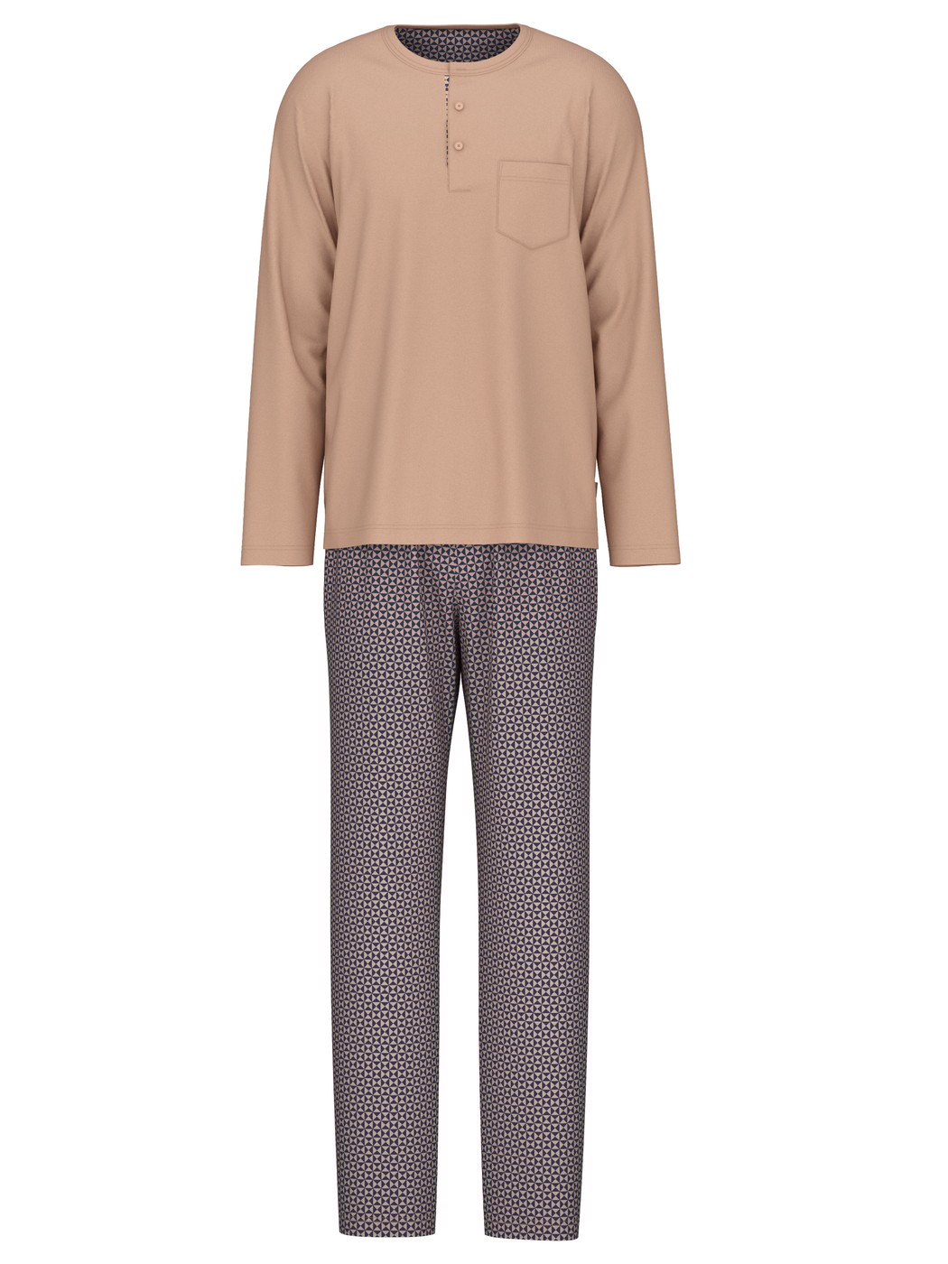 Long pyjamas for men from the RELAX SELECTED series by CALIDA. The classic style consists of patterned pants and a block colour long-sleeve shirt with patch-style breast pocket. The pure cotton in soft interlock quality offers unlimited wearing comfort.