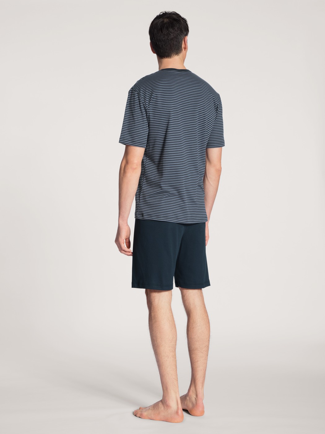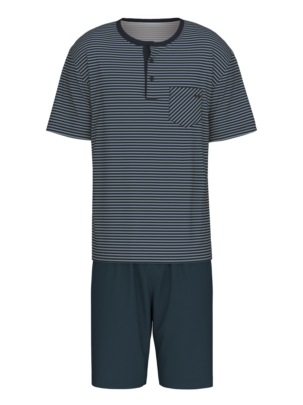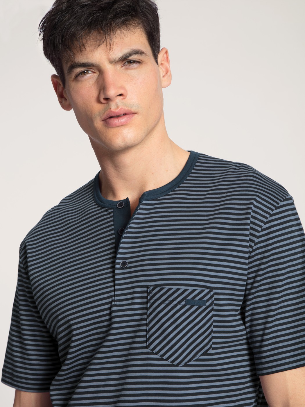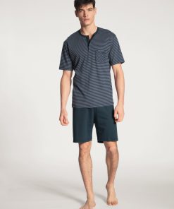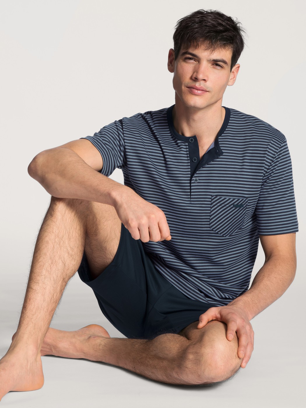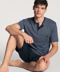 These CALIDA short pyjamas with button tab from the RELAX STREAMLINE series boast a high-quality finish and simple, masculine design. The classic striped top has a colour block trim on its button placket tab and breast pocket and piping with a high-quality finish. It is accompanied by short colour block pants.