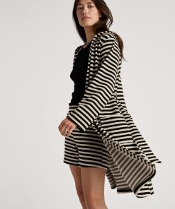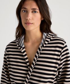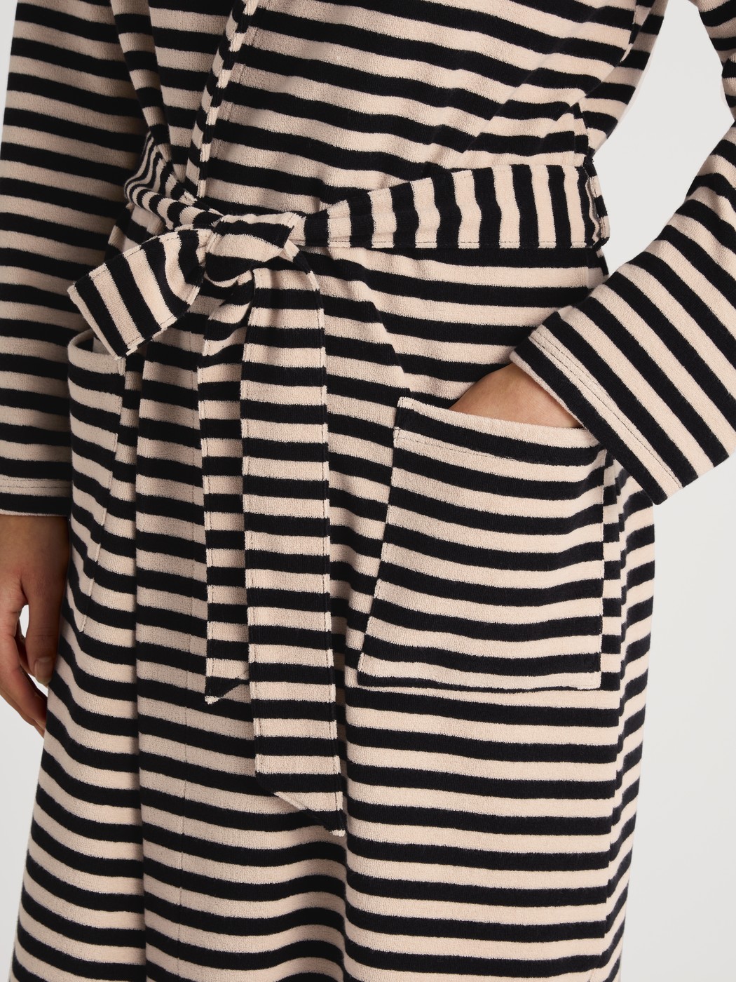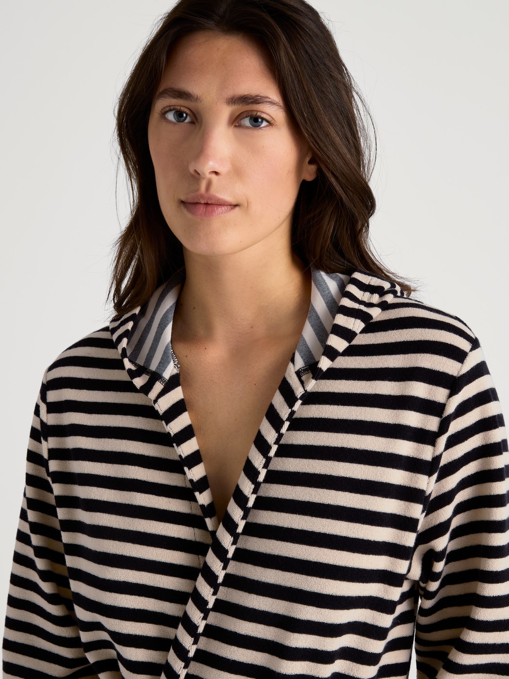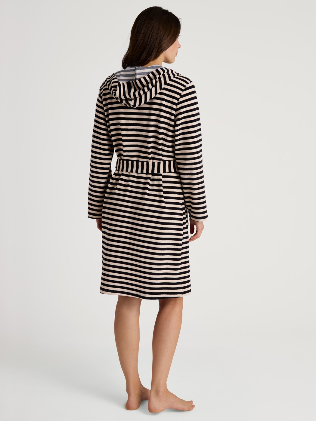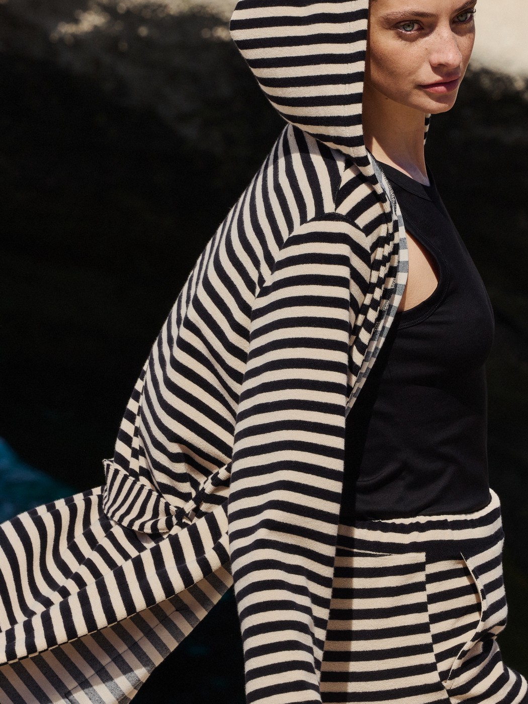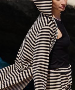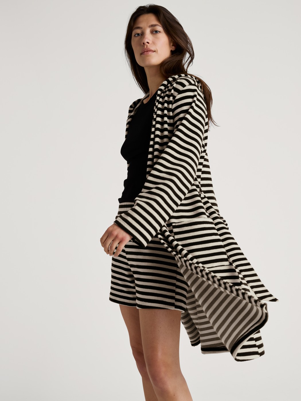 The LOUNGE STRIPES terry cloth line combines timeless comfort with all-round style. Consisting of a polo shirt, shorts and a bathrobe with a hood, the line features a black-and-white striped look that can be paired to create the perfect set for the home, the beach or casual streetwear. The cuddly terry cloth made from cotton and polyester is soft to the touch and highly absorbent – ideal for after a swim or for warm summer days. Thanks to the boxy, oversized cut, the styles can be worn by all genders and offer a relaxed fit that guarantees maximum comfort and freedom of movement.