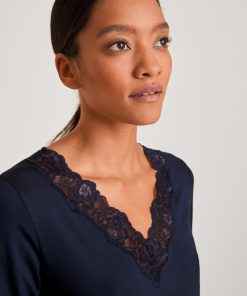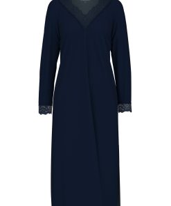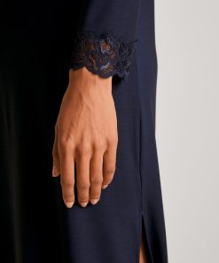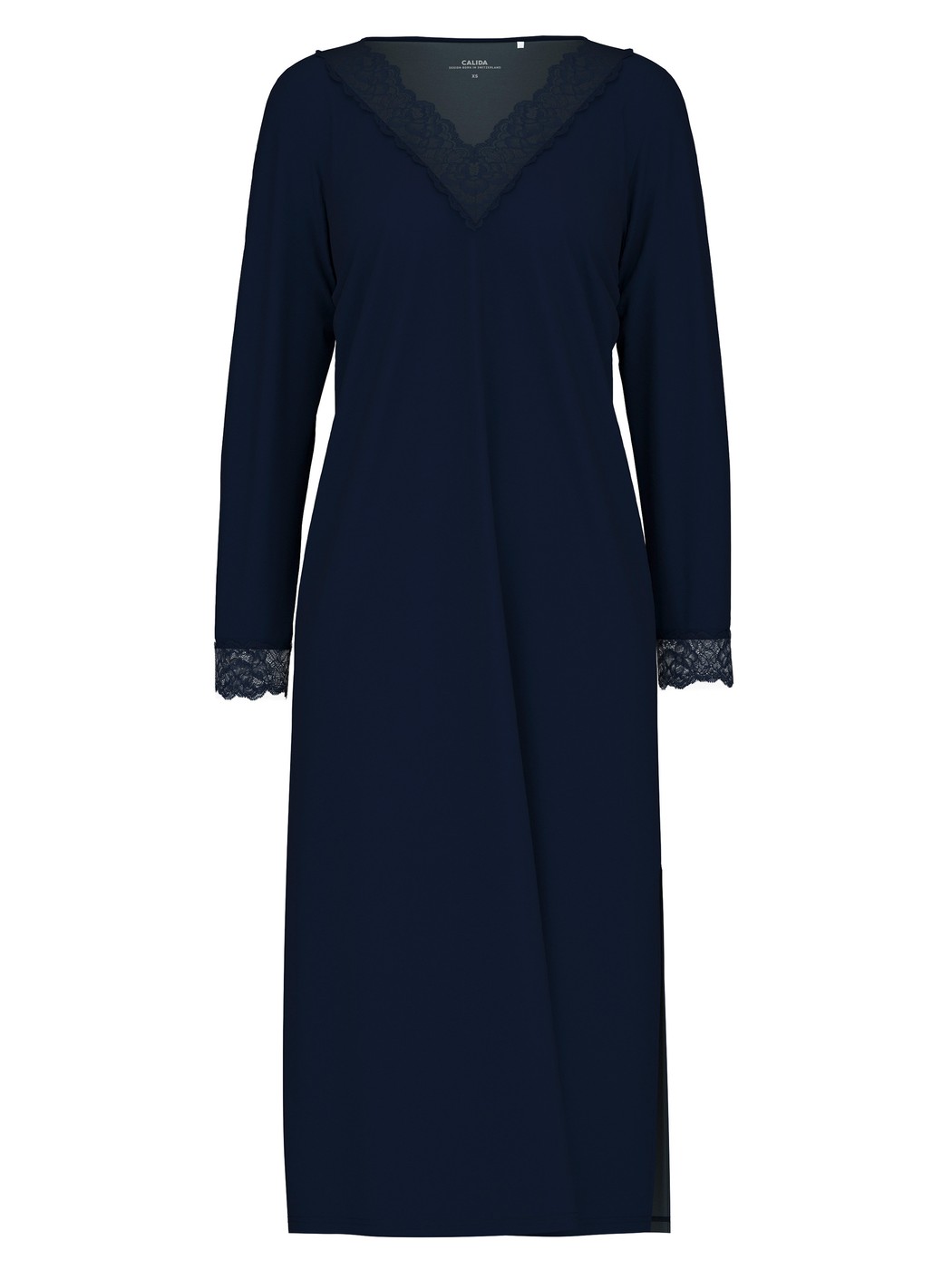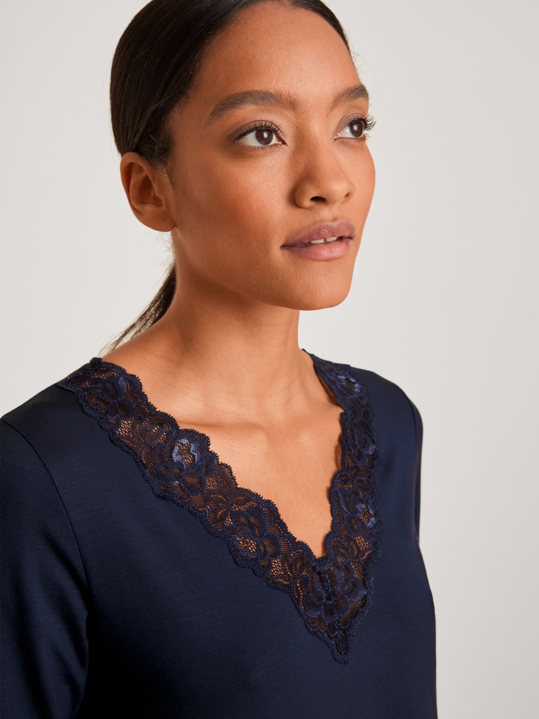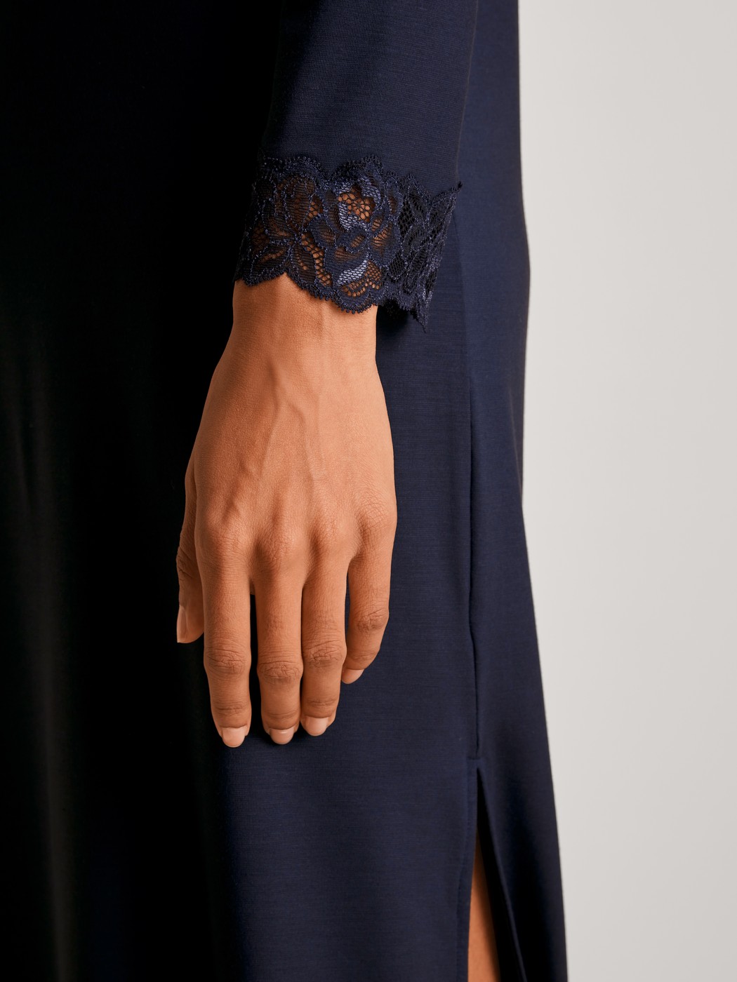 In every woman there’s a queen. The ELEGANT DREAMS long-sleeve nightdress by CALIDA emphasises this fact with incredible elegance and self-confident femininity. Against a blue background, lace details on the sleeves and V-neck add a hint of majestic opulence. All the while, this long dress made from TENCEL™ Modal fibres retains a sleek, flowing silhouette. Perfect for ice queens and everyone else besides!