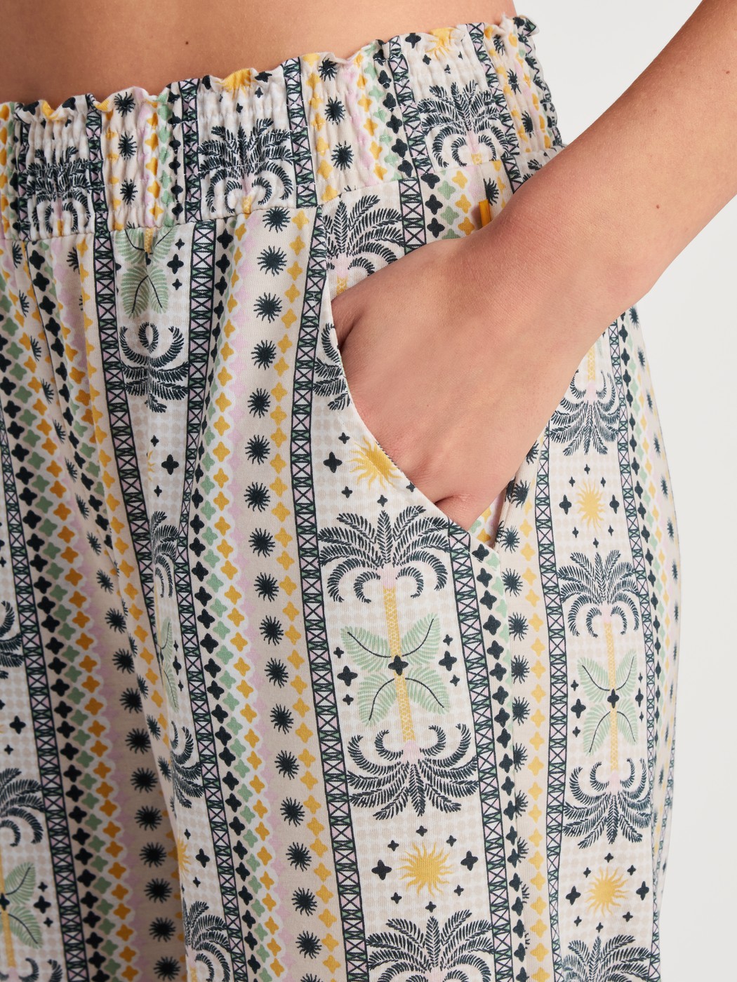The FAVOURITES SUN mix & match range brings joie de vivre and feel-good moments. Stylish palm tree and sun elements in shades of yellow, beige and black create a warm look. Highlights include a boxy-cut short-sleeved shirt and shorts in dune beige muslin, which can be worn as a set or combined in a variety of ways. The collection is complemented by a sunshine yellow T-shirt, shorts and capri trousers with a Greek boho-chic palm print, as well as V-neck shirts and trousers with a two-colour palm leaf print. Perfect for creative looks – within the range and beyond.