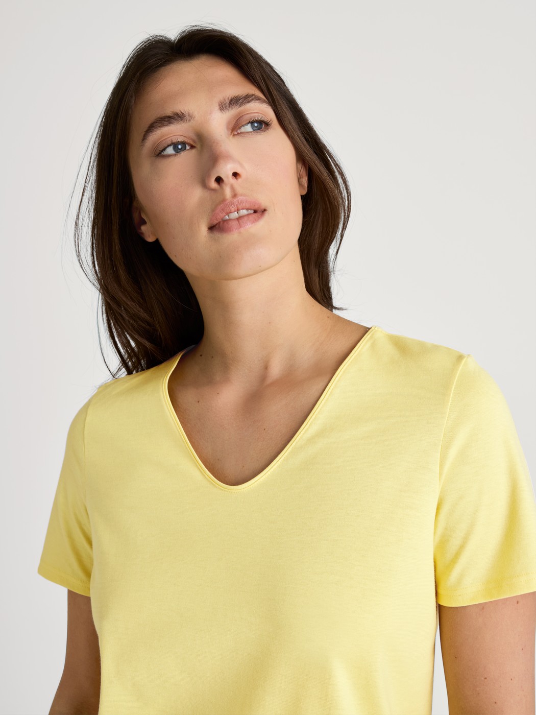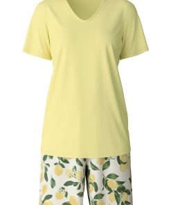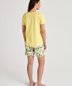 The FRUITY DREAMS sleepwear line in a radiant pineapple and lemon print brings summery lightness to the bedroom. Inspired by Greek moments of indulgence, the short-sleeve nightdress, short pyjamas, 3/4 pyjamas and buttoned pyjamas with an all-over print offer fresh new design and comfort. Made from 100% organic cotton, the line promises a soft feel, breathability and natural temperature regulation – perfect for warm summer nights. The flowing cuts ensure light and airy comfort.