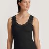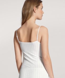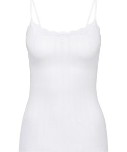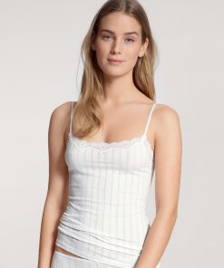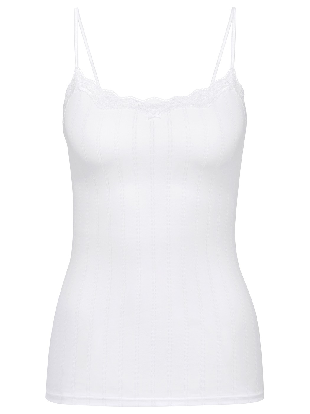 The spaghetti top from the ETUDE TOUJOURS basic series by CALIDA features an elegant fine-rib texture in elastic cotton jersey. Thanks to the use of high-quality cotton, this camisole offers a very soft, silky touch and excellent resistance to pilling. The delicate lace is carefully integrated, and the narrow satin straps are adjustable.